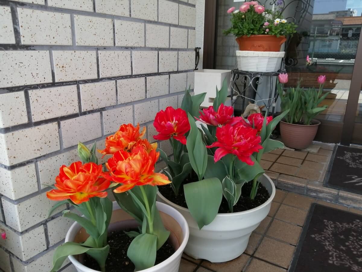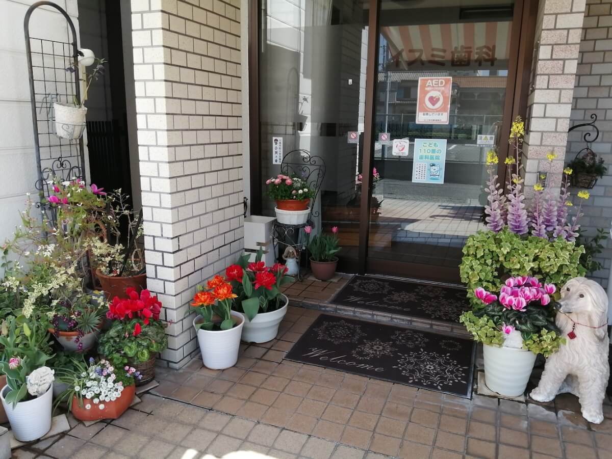 井角歯科医院の玄関先にもチューリップなど春の花々が元気に咲い